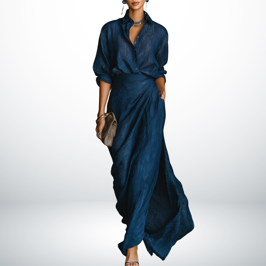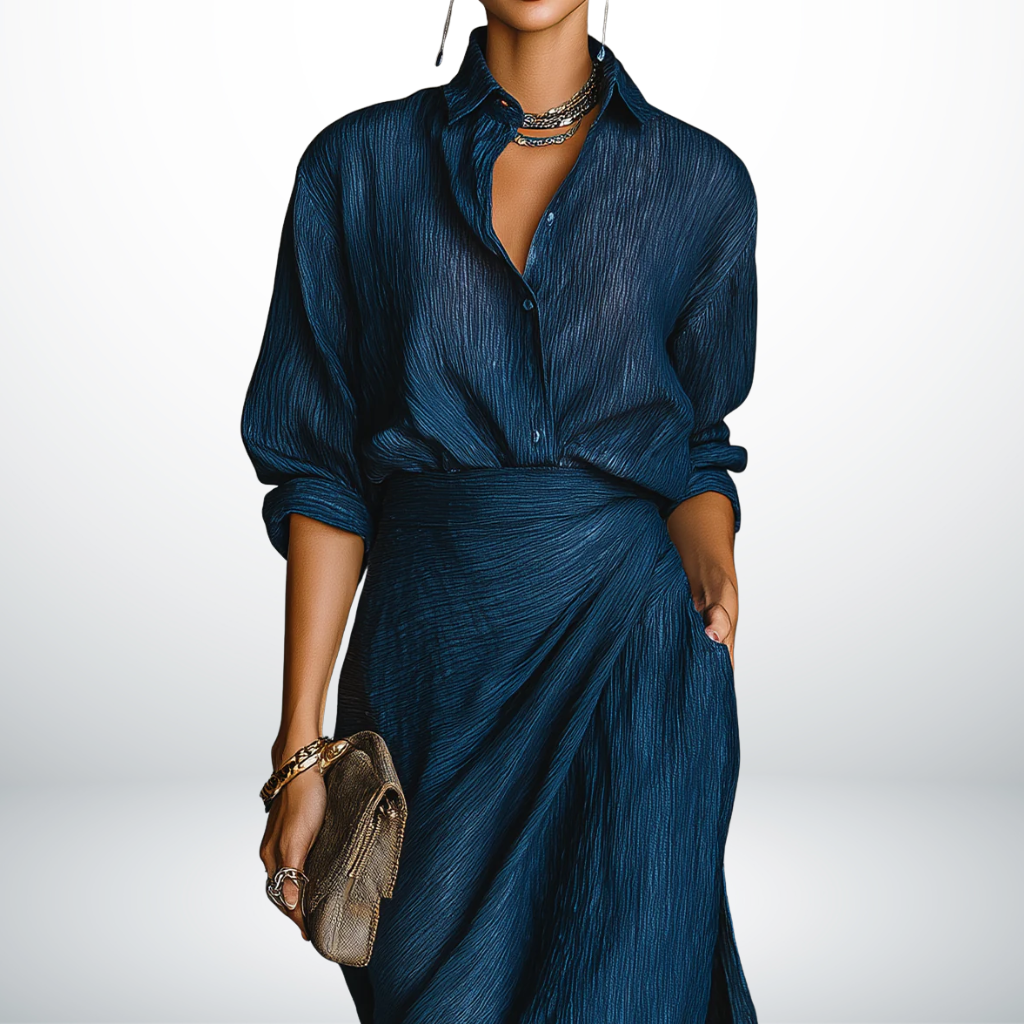 Voel u moeiteloos elegant in deze prachtige set van blouse en rok. Het donkerblauwe ensemble combineert tijdloze klasse met moderne draagbaarheid, waardoor u er verzorgd uitziet zonder in te leveren op comfort. Perfect voor de vrouw die zowel stijl als gemak waardeert in haar dagelijkse garderobe.