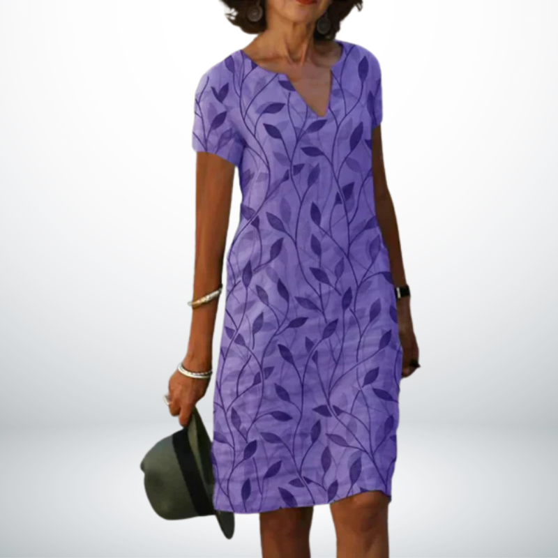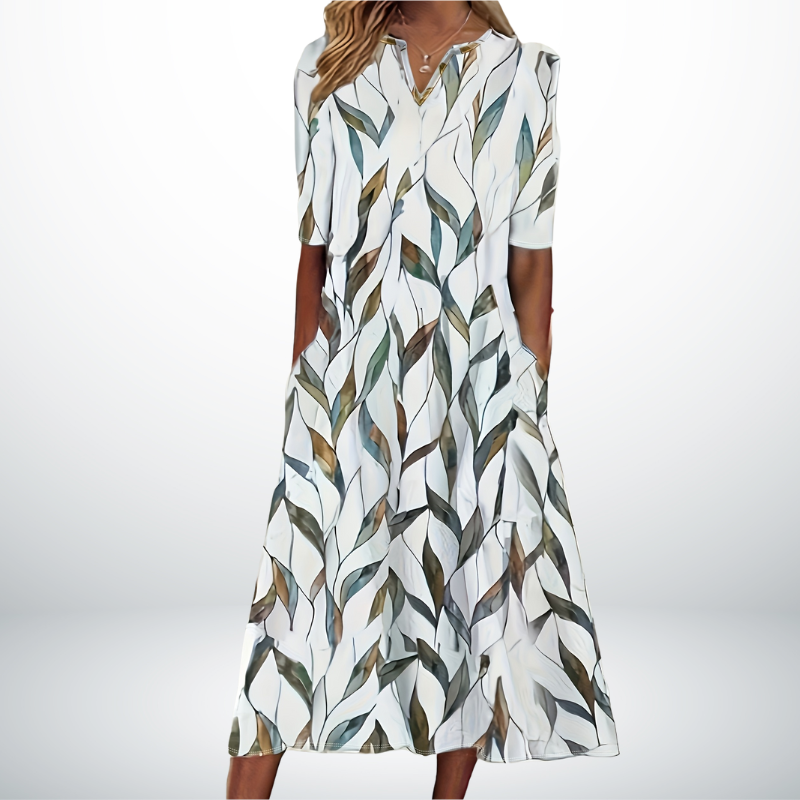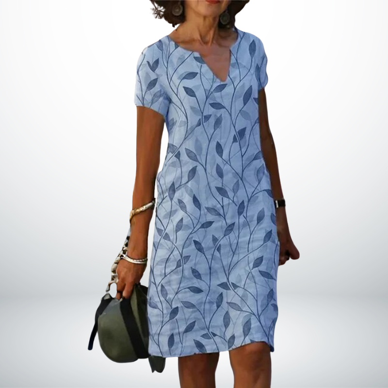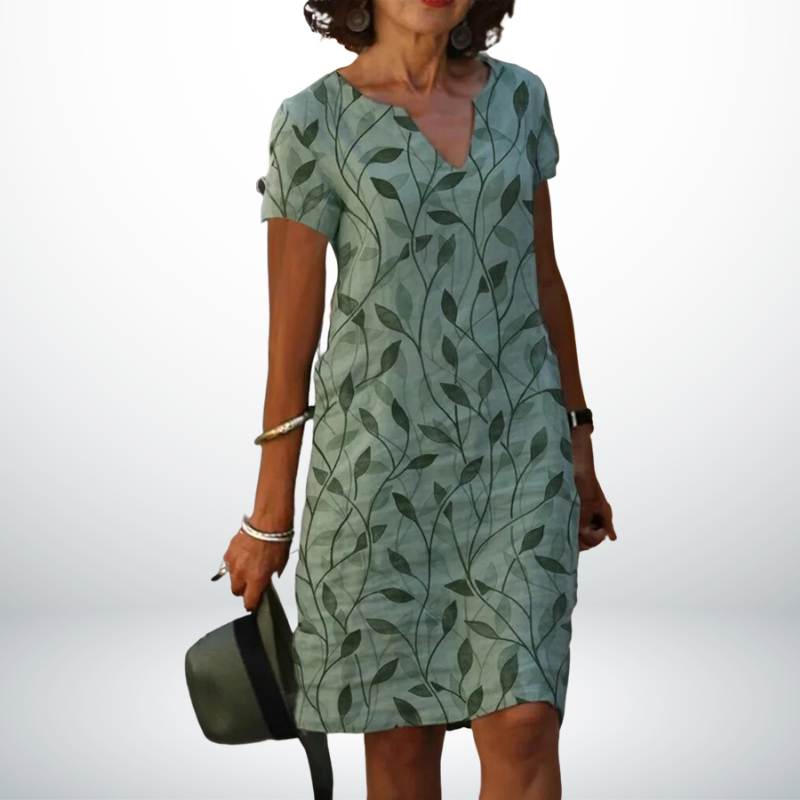 Inès™ is dé jurk voor zomerse dagen waarop je er stijlvol uit wilt zien zonder in te leveren op comfort. De luchtige stof, korte mouwen en flatterende V-hals zorgen voor een moeiteloze en vrouwelijke uitstraling. De subtiele bladprint geeft deze jurk een frisse en natuurlijke look – perfect voor op vakantie, een wandeling door de stad of een lunch op het terras.