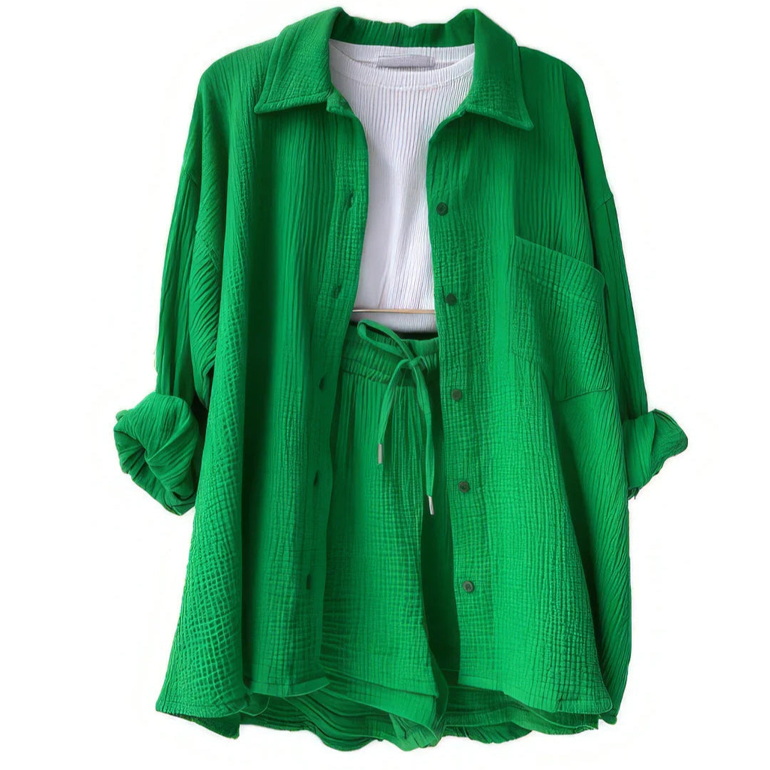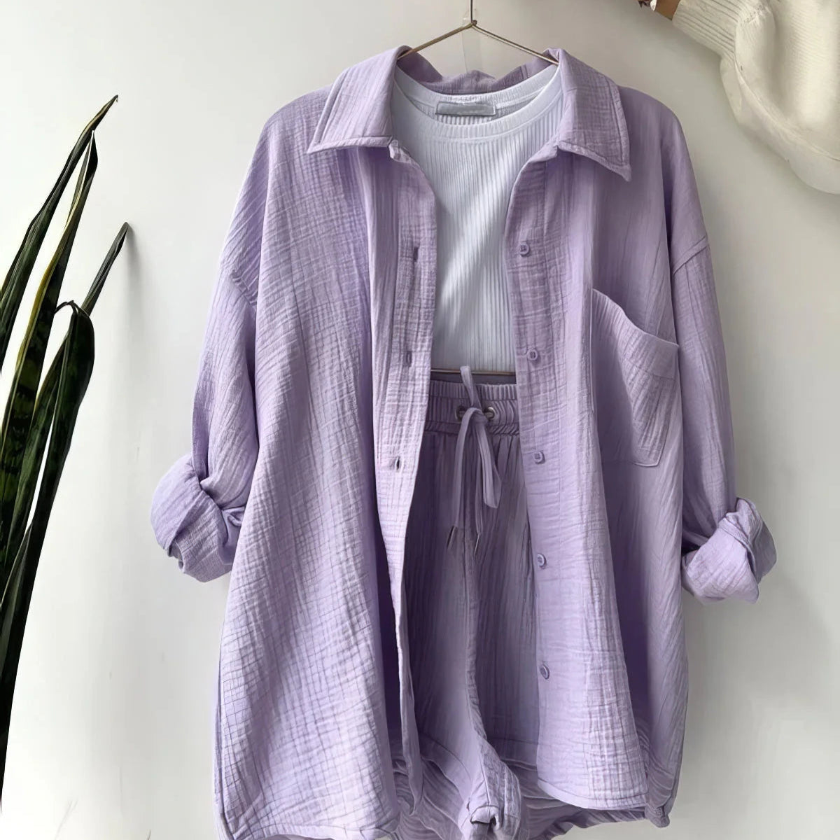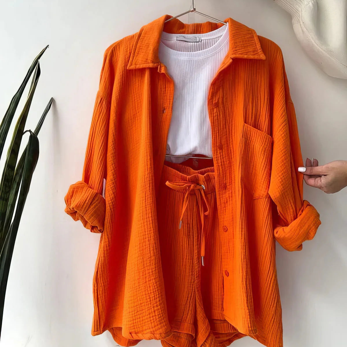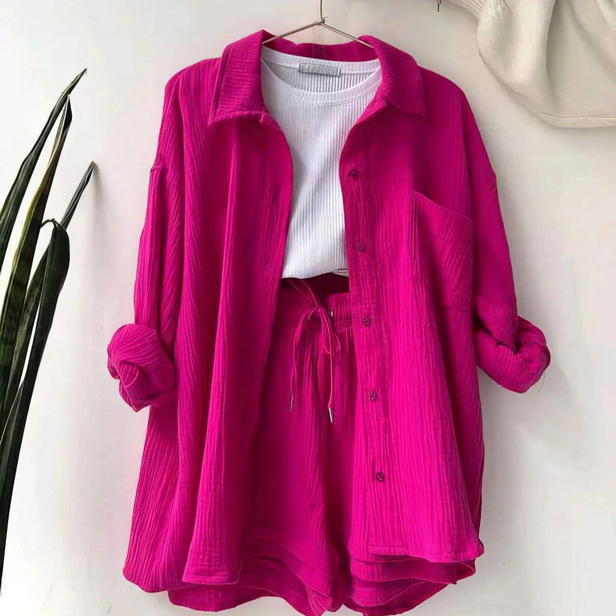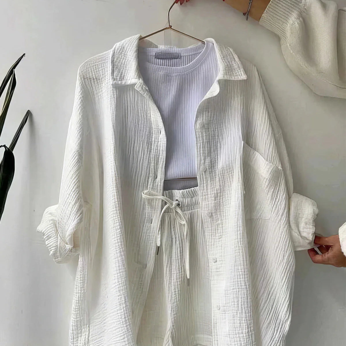 Ontdek de moeiteloze elegantie van de Linn™ – Comfortabel Tweedelig Setje. Dit stijlvolle ensemble combineert een luchtige top met een perfect bijpassende broek, ideaal voor ontspannen dagen waarop je er toch verzorgd uit wilt zien. Voor de vrouw die comfort en stijl in één beweging omarmt.