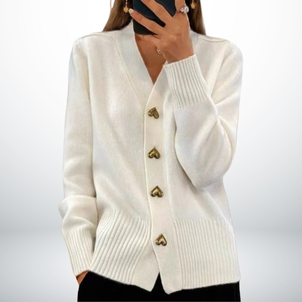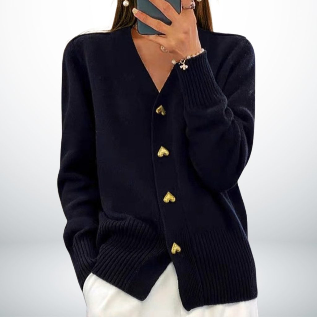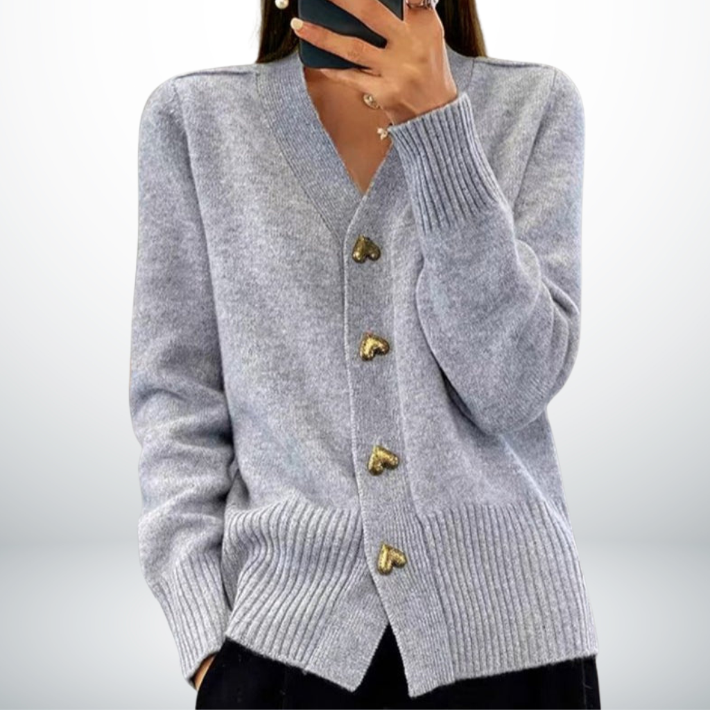 De Lucinda™ cardigan combineert elegantie met een vleugje speelsheid. De hartvormige knopen geven dit vest een charmant detail, terwijl de zachte stof en vrouwelijke pasvorm zorgen voor ultiem draagcomfort. Perfect voor de vrouw die haar stijl subtiel maar betekenisvol wil uitdrukken – elke dag opnieuw.