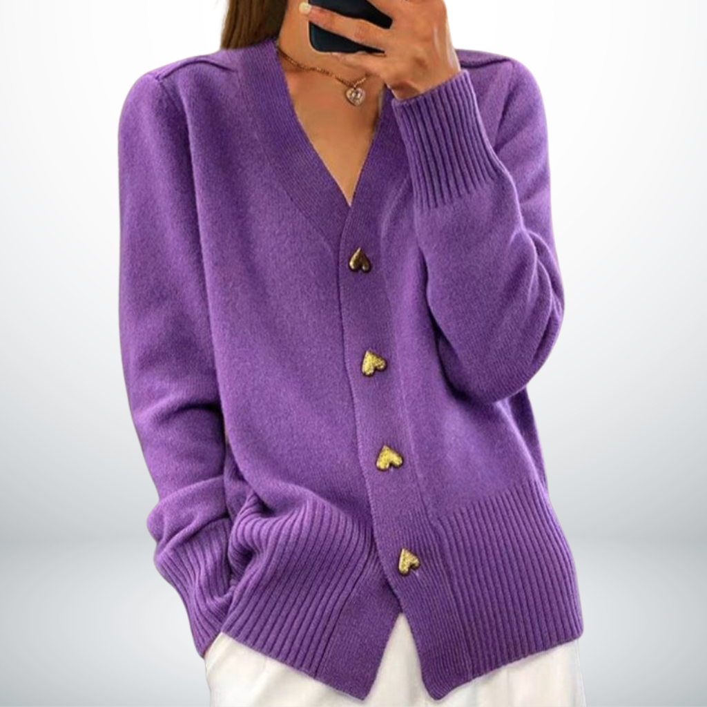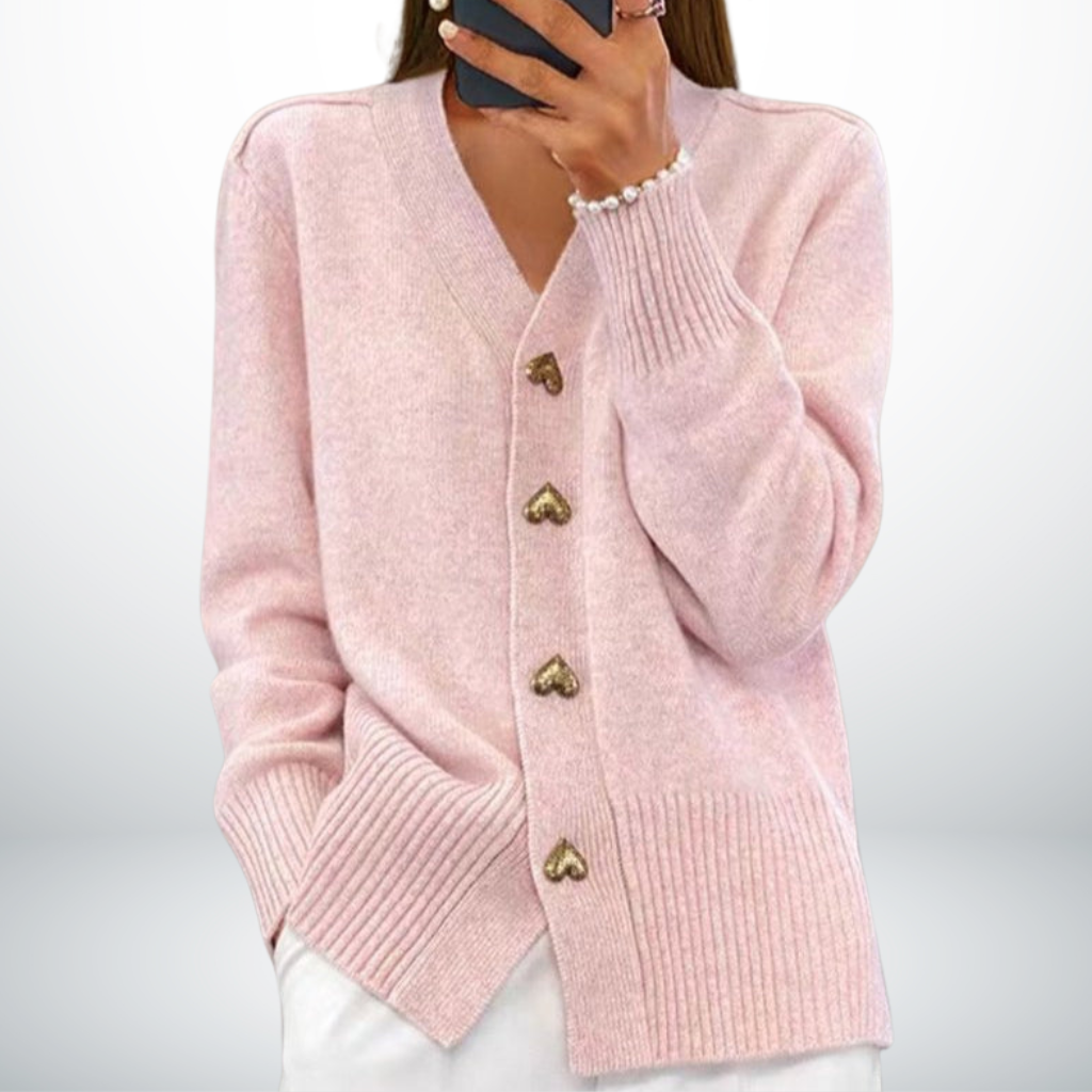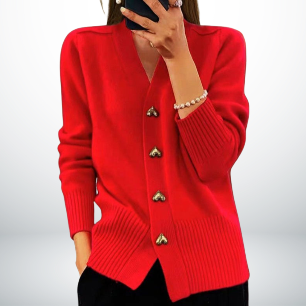 De Lucinda™ cardigan combineert elegantie met een vleugje speelsheid. De hartvormige knopen geven dit vest een charmant detail, terwijl de zachte stof en vrouwelijke pasvorm zorgen voor ultiem draagcomfort. Perfect voor de vrouw die haar stijl subtiel maar betekenisvol wil uitdrukken – elke dag opnieuw.