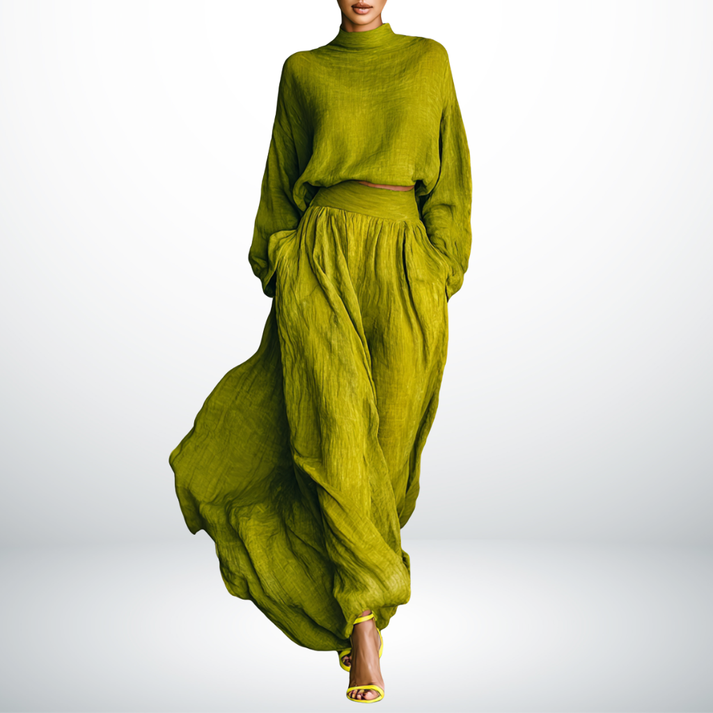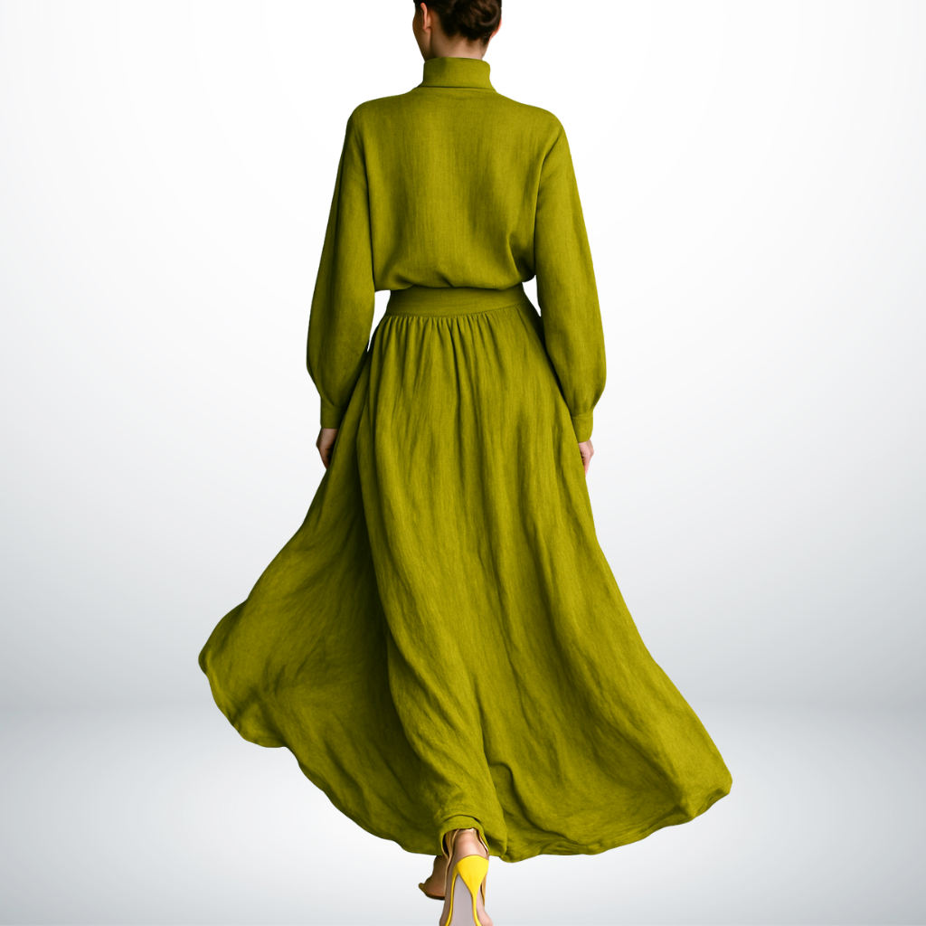 Een jurk die moeiteloos comfort en klasse samenbrengt. De frisse groene tint straalt levendigheid uit, terwijl de elegante snit het figuur op een subtiele manier flatteert. Ideaal voor de vrouw die zich stijlvol én ontspannen wil voelen – van een zomerse lunch tot een avondje uit.
