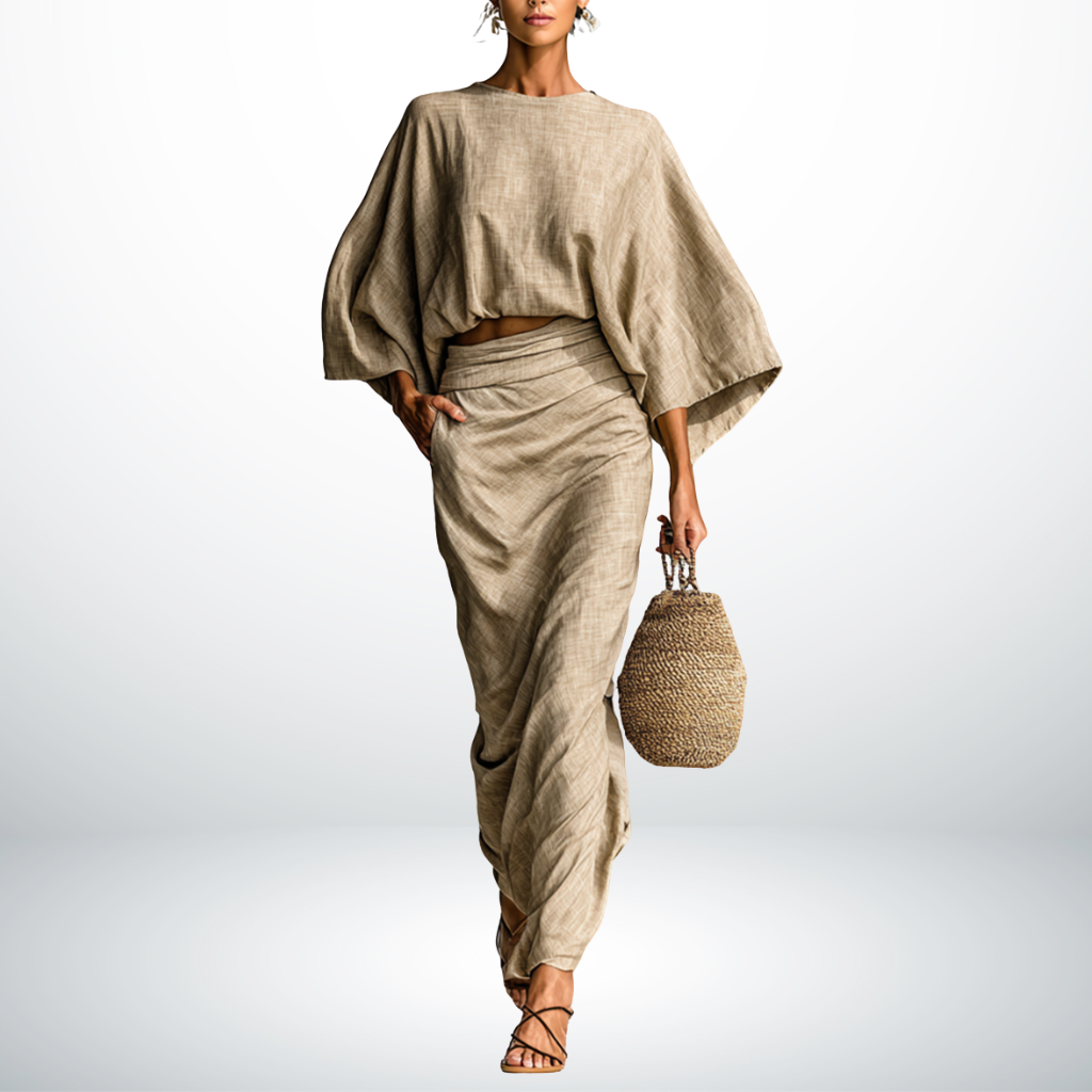 Met de Marisa™ set ervaart u de perfecte balans tussen elegantie en draagcomfort. De lange mouwen en vloeiende rok zorgen voor een tijdloze uitstraling die flatterend en moeiteloos chic aanvoelt. Een veelzijdige keuze voor de vrouw die stijlvol voor de dag wil komen, zonder in te leveren op gemak.