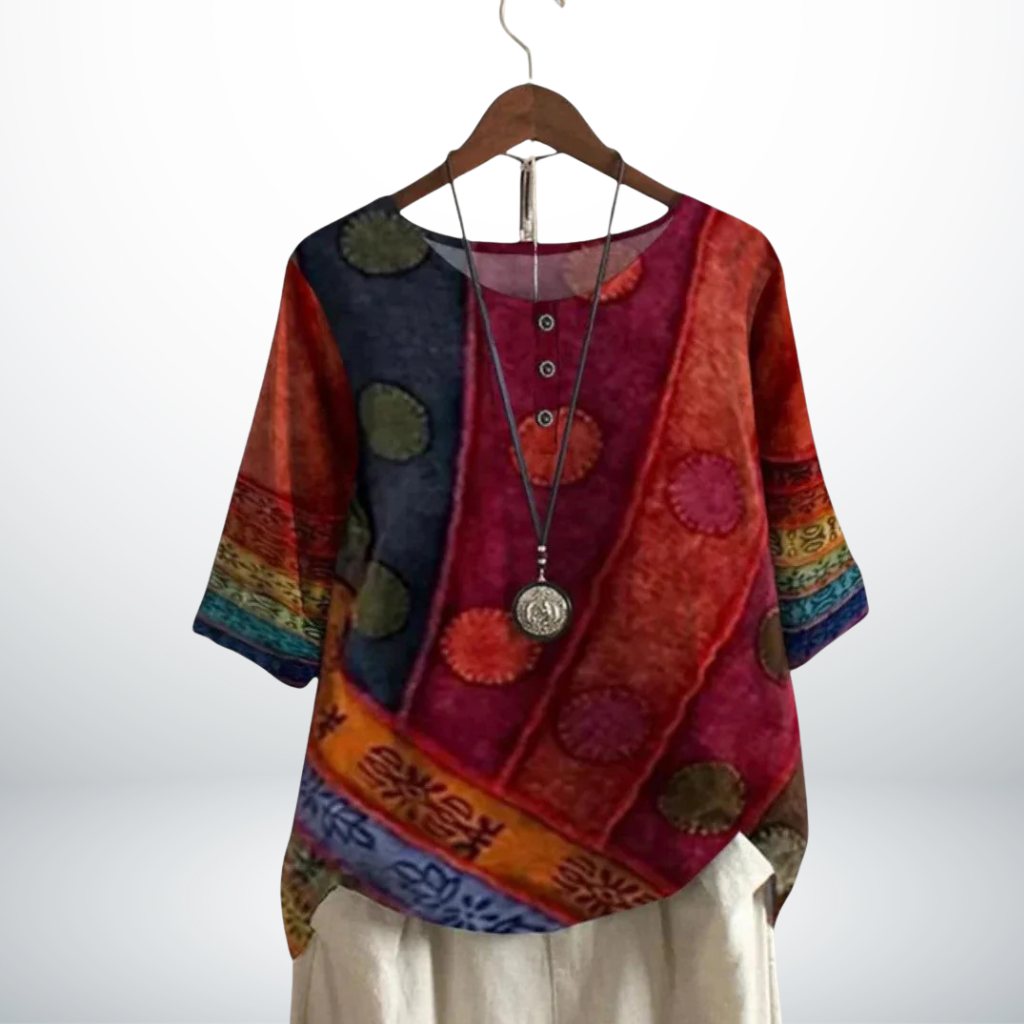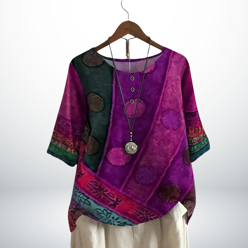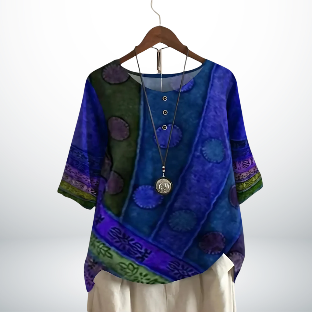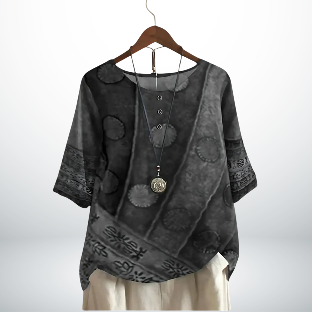 Voel je stijlvol én op je gemak met deze prachtige top, ontworpen voor de vrouw die houdt van klasse met een vleugje creativiteit. De unieke print geeft een verfijnde uitstraling, terwijl de soepele pasvorm zorgt voor een flatterend silhouet. Perfect om moeiteloos te combineren, of je nu een ontspannen lunch hebt of een chique avondje uit.