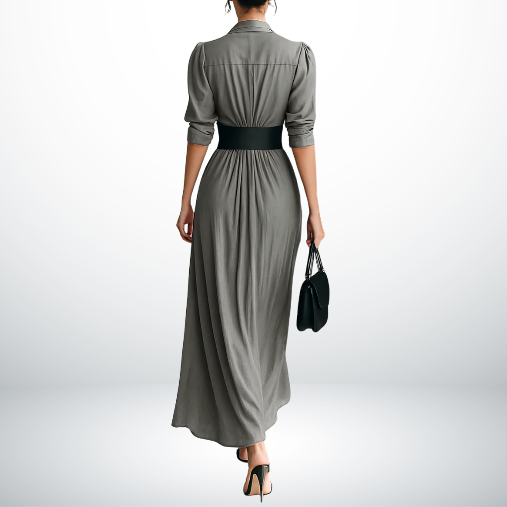 - Verfijnde Kraag – De elegante reverskraag geeft de jurk een klassieke en stijlvolle uitstraling.