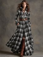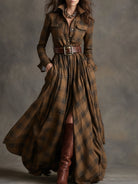 De Helena™ – Flatterende Maxi-Jurk combineert de verfijnde look van een overhemdjurk met de soepelvallende elegantie van een lange jurk. De zachte stof, klassieke kraag en volledige knopenrij geven de jurk een stijlvolle én praktische uitstraling, terwijl de subtiele ruitprint zorgt voor een tijdloze, moderne look. Perfect voor dagen waarop je er moeiteloos verzorgd uit wilt zien.