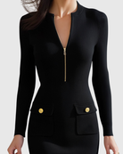 - Chique gouden accenten: De rits aan de voorkant en de knopen van de zak voegen een vleugje luxe toe, waardoor deze tijdloze zwarte jurk subtiele verfijning krijgt.