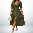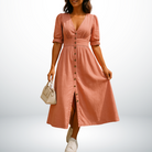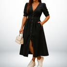 - Tijdloos Detail – De knoopsluiting geeft de jurk een verfijnde en klassieke uitstraling.