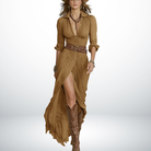 Deze verfijnde maxi jurk is het perfecte voorbeeld van tijdloze klasse en modern comfort. Het luchtige linnen voelt zacht en koel aan, terwijl de omgeslagen kraag en elegante lengte zorgen voor een stijlvolle uitstraling. Ideaal voor de vrouw die zich zowel zelfverzekerd als ontspannen wil voelen, van een zomerse dag tot een avondlijk diner.