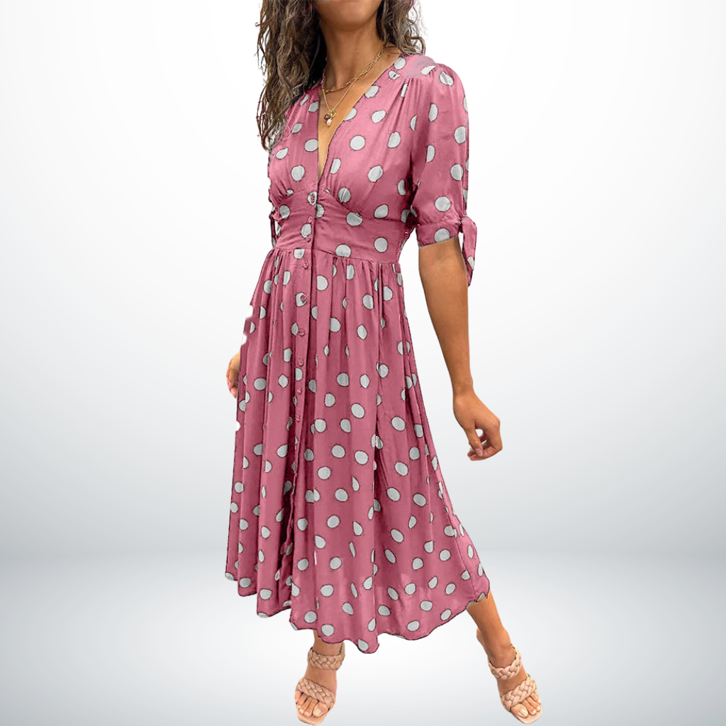 Laat je vrouwelijke charme stralen met de Monique™ – Elegante Jurk met Polkadots. De speelse stippenprint gecombineerd met een flatterende pasvorm maakt deze jurk een perfecte keuze voor de vrouw die stijlvol voor de dag wil komen, zonder in te leveren op comfort. Ideaal voor zowel een zomerse dag uit als een verfijnde avondlook.
