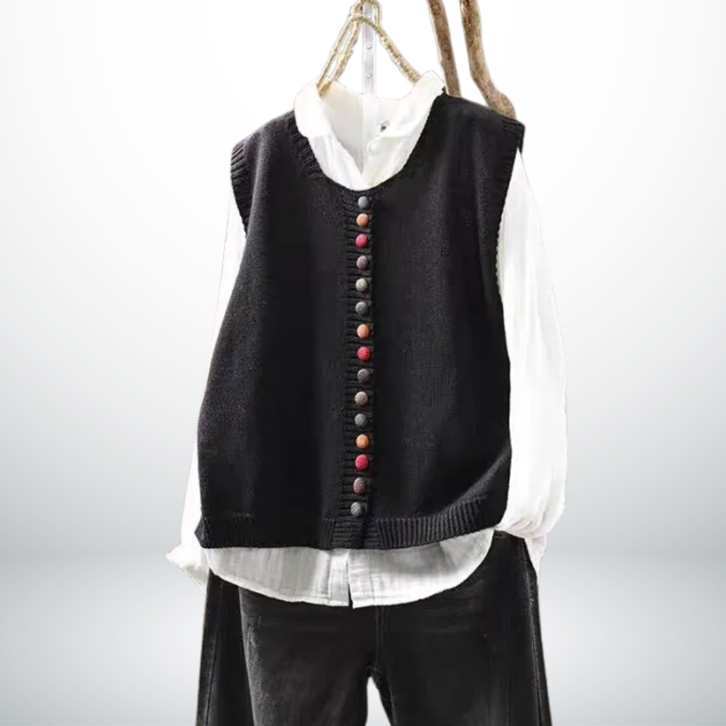Het Nadine™ Gebreid Herfstvest is een tijdloze toevoeging aan de garderobe. Dit elegante mouwloze vest combineert warmte en stijl met subtiele details zoals de kleurrijke knoopjes aan de voorzijde. Dankzij de zachte, gebreide structuur en natuurlijke tint past het moeiteloos bij elke blouse of top – perfect voor frisse herfstdagen.